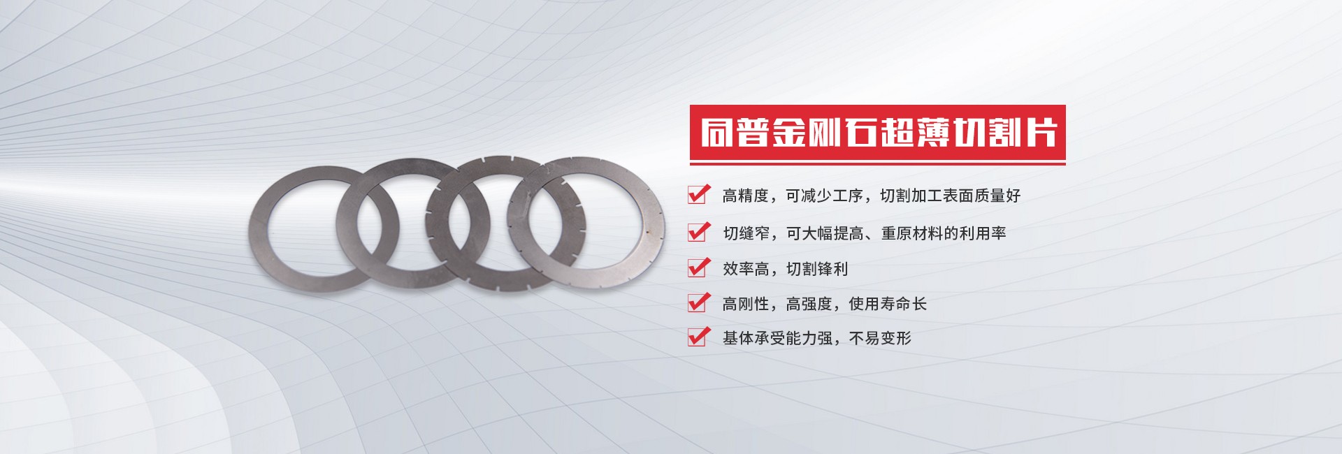 公司研發(fā)并生產(chǎn)的超薄型金剛石砂輪切割片,主要應(yīng)用于電子工業(yè)領(lǐng)域?qū)Ω鞣N非金屬硬脆材料進(jìn)行切割或開槽加工,如硅、鍺、磷化鎵、砷化鎵、磷砷化鎵、鐵氧體、鈮酸鋰、鉭酸鋰、壓電陶瓷、光學(xué)陶瓷、玻璃等。其產(chǎn)品具有割縫窄、精度高、壽命長等特點(diǎn)。